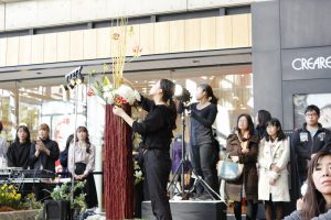 フラワービジネス科では、20年の歴史に恥じぬように、毎日遅くまで学校に残りグループごとに大作に挑戦しました。想い通りに出来ず落ち込んだ時にも、応援してくれる仲間と先生方がいました。温かく見守ってくれた先生たちのお陰で、買い物に来ている方が、思わず足を止めて見入ってしまうような独創的な作品に仕上げることができました。